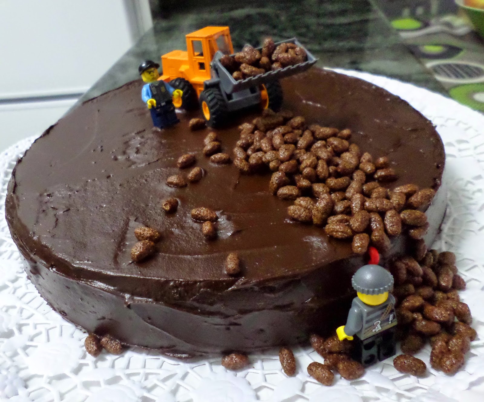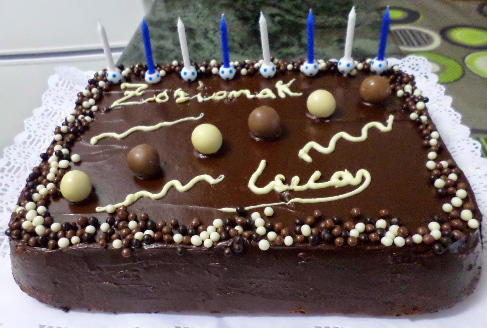 Dejamos el bizcocho encima de una rejilla que enfríe un poco. Ponemos el chocolate cobertura a baño maría y una vez esté disuelto añadimos la nata y lo esparcimos encima del bizcocho ayudándonos de una espátula. He disuelto también un poco de chocolate blanco para hacer el adorno.